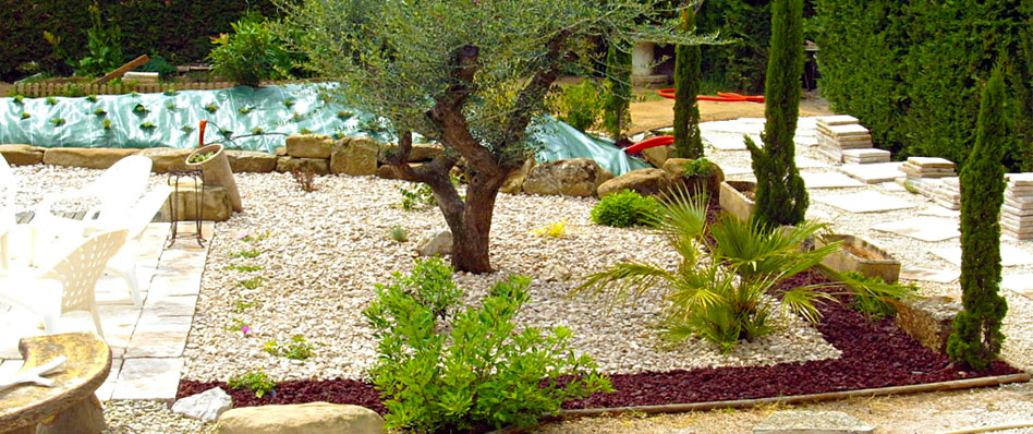 Nous sommes spécialisés dans la réalisation de massifs secs inspirés des paysages Provençaux, composés entre autre de minéraux, d'arbustes persistants et de vivaces adaptées à notre région.